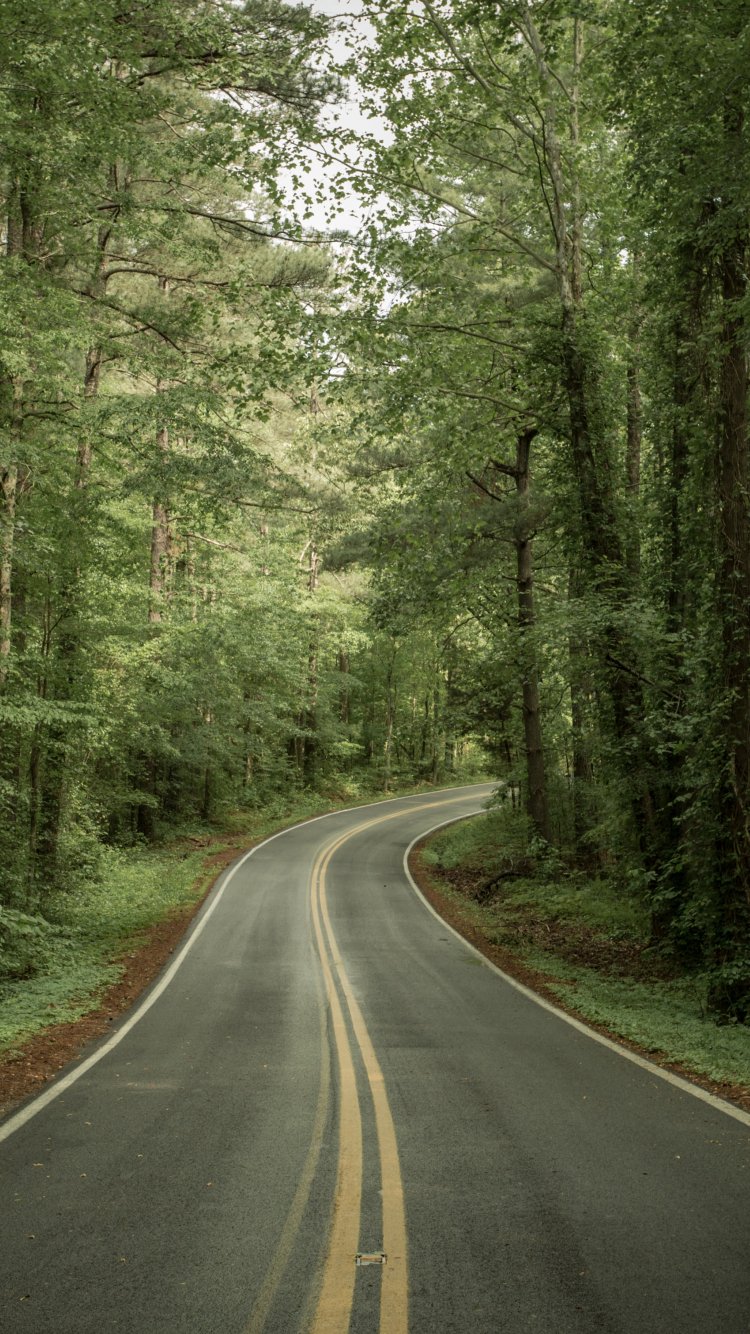 road, forest, green Wallpaper 750x1334