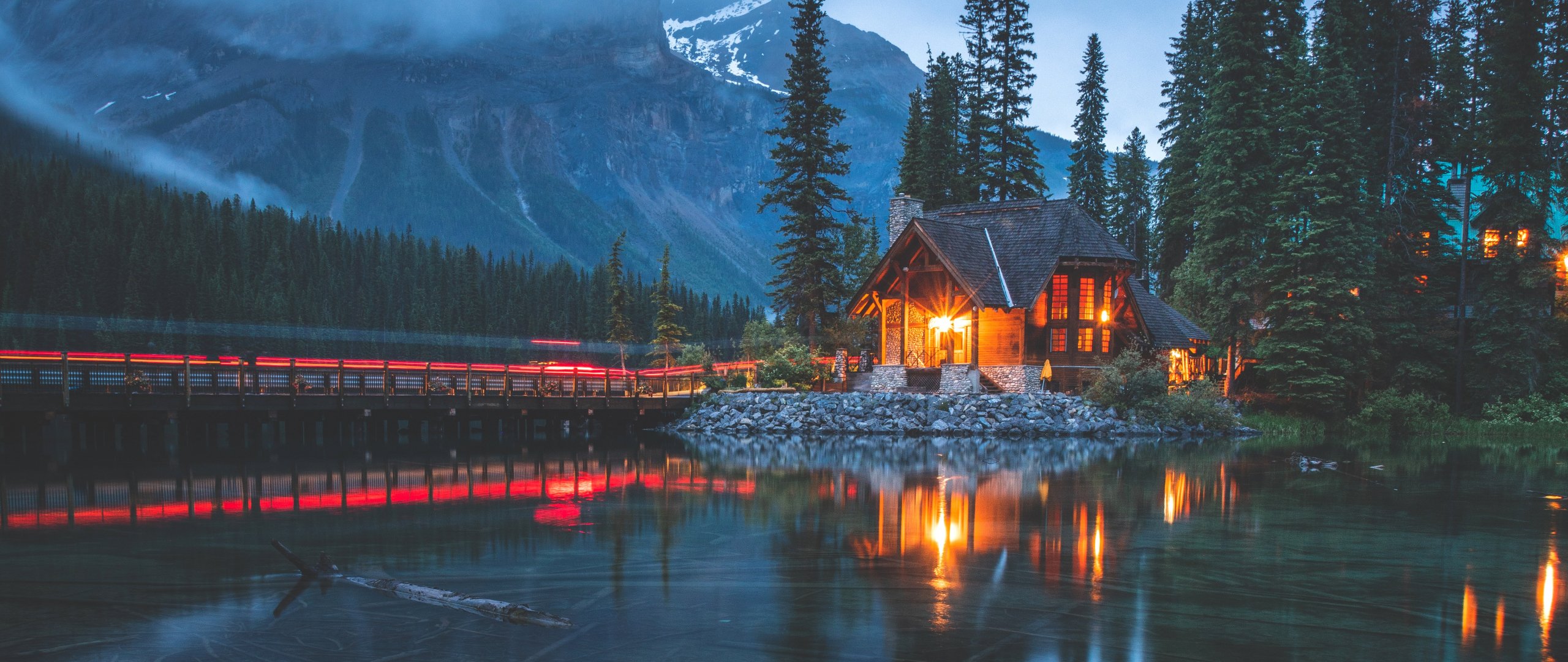 Wallpaper: lake house, lake, night - 2560x1080