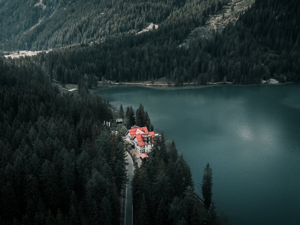 Wallpaper: lake house, bird's eye view, green - 1024x768