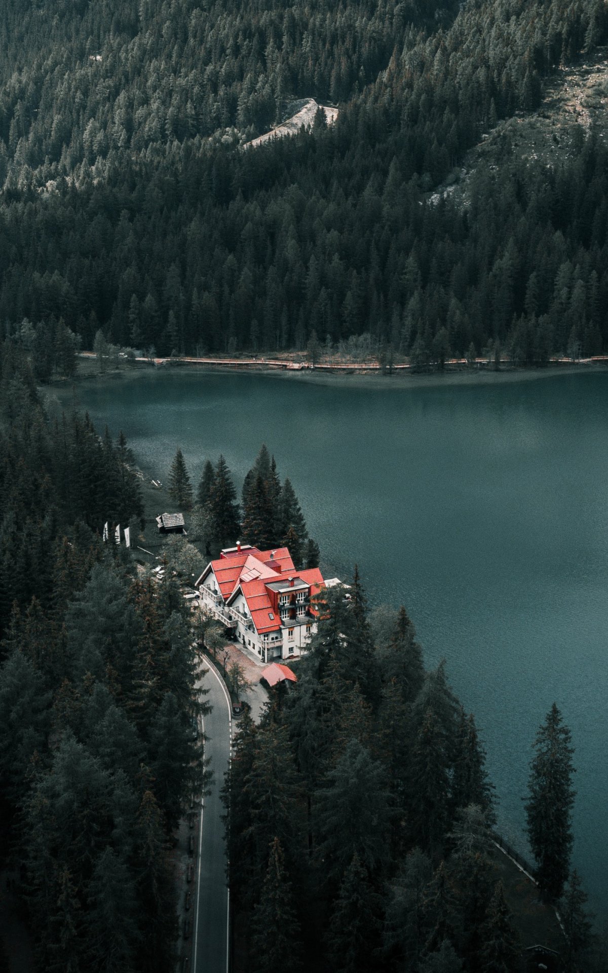 Wallpaper: lake house, bird's eye view, green - 1200x1920