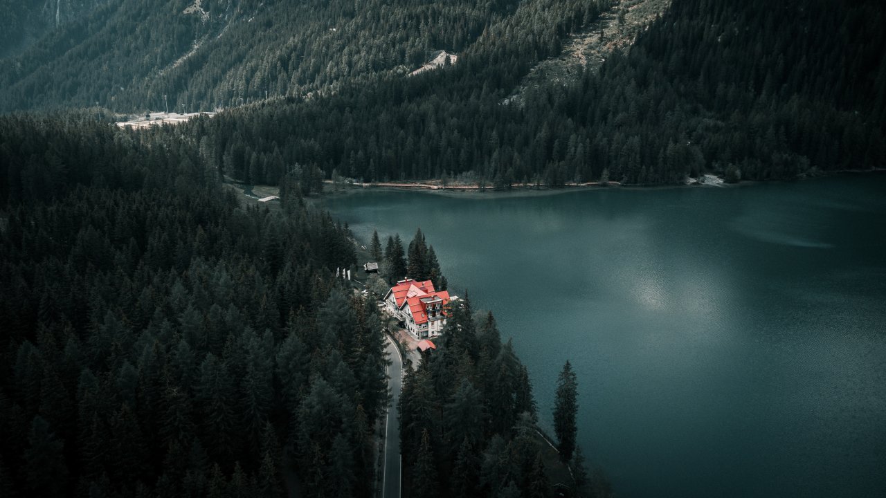 Wallpaper: lake house, bird's eye view, green - 1280x720
