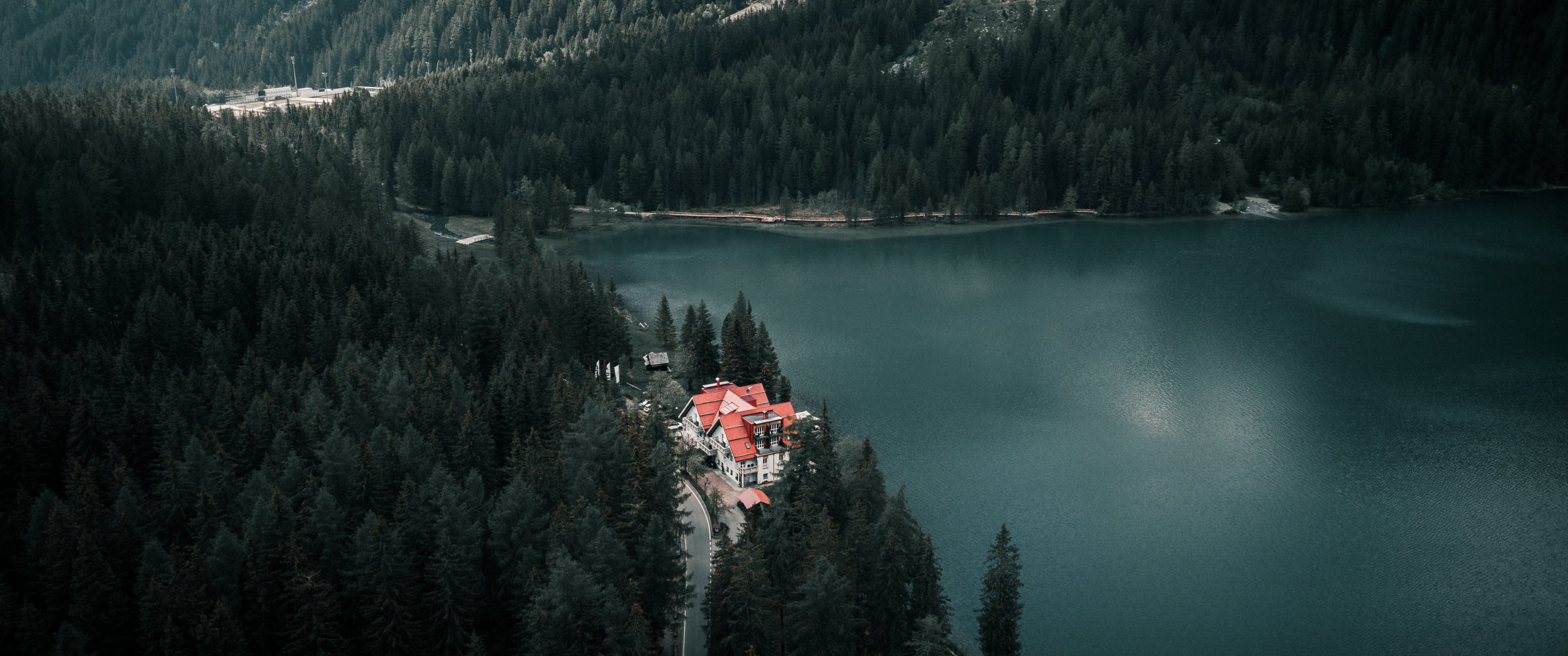Wallpaper: lake house, bird's eye view, green - 3440x1440