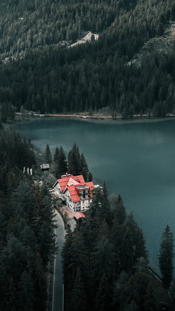 Wallpaper: lake house, bird's eye view, green - 720x1280