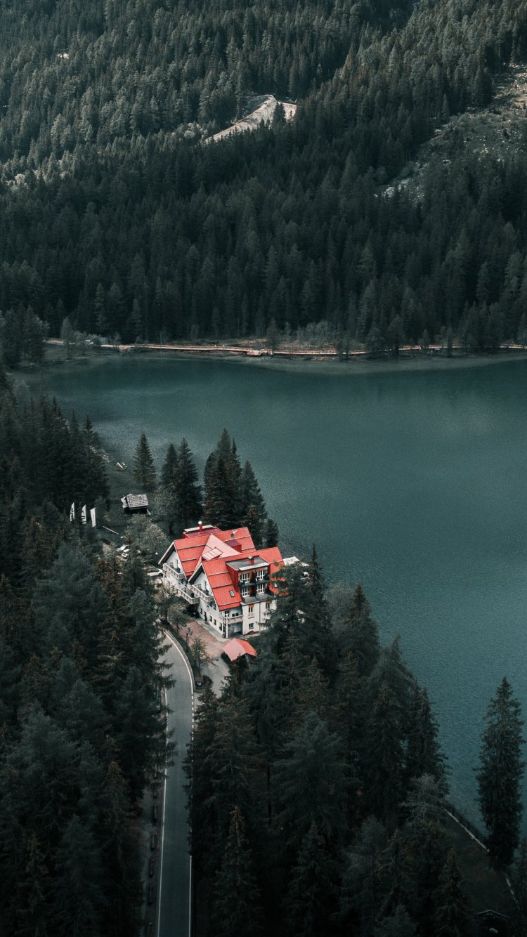 Wallpaper: lake house, bird's eye view, green - 750x1334