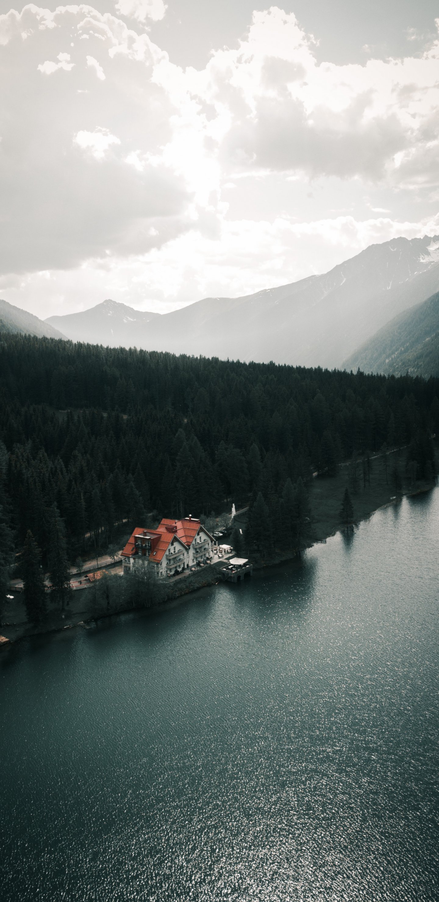 Wallpaper: lake house, bird's eye view, green - 1440x2960