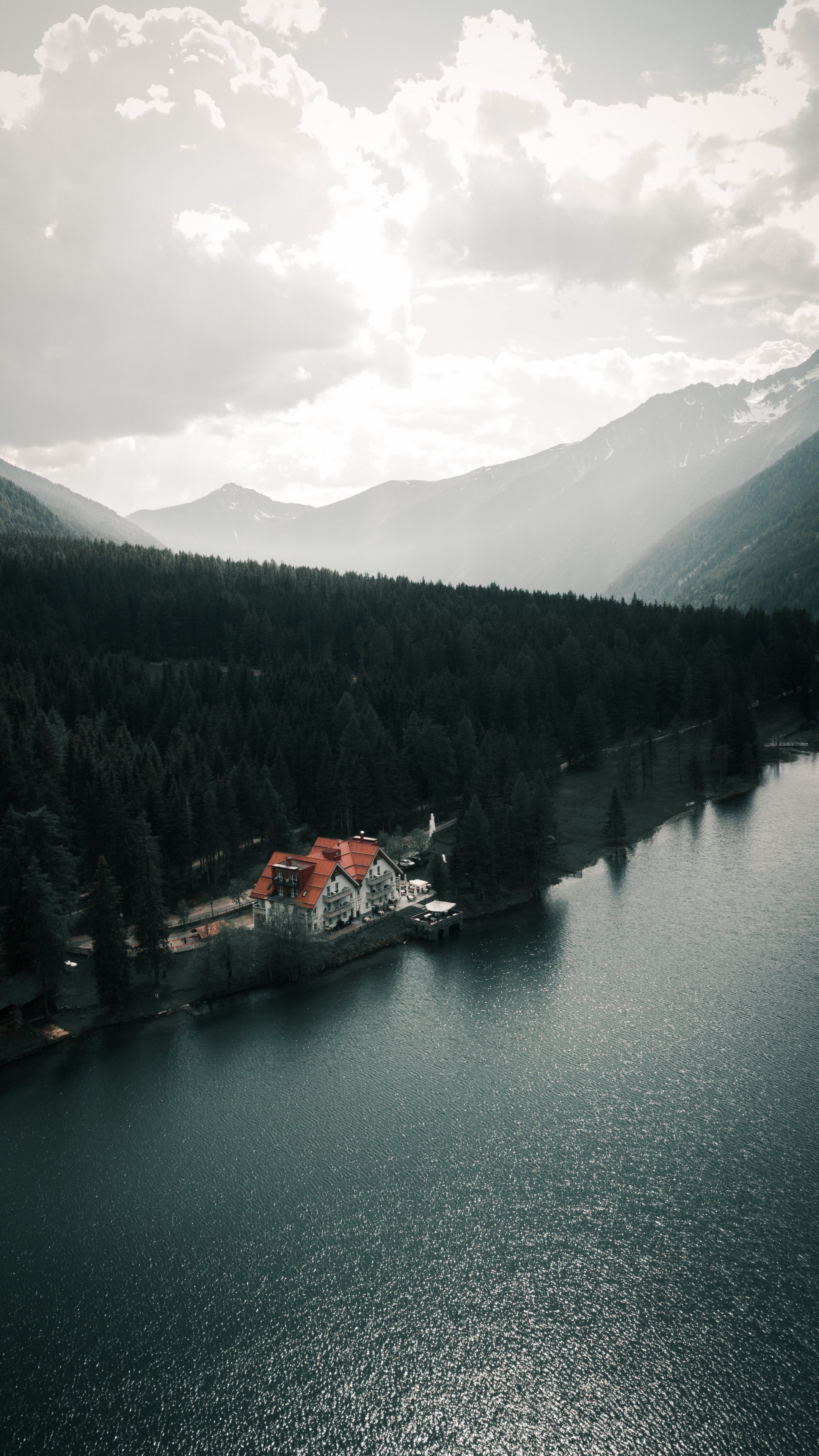 Wallpaper: lake house, bird's eye view, green - 2160x3840