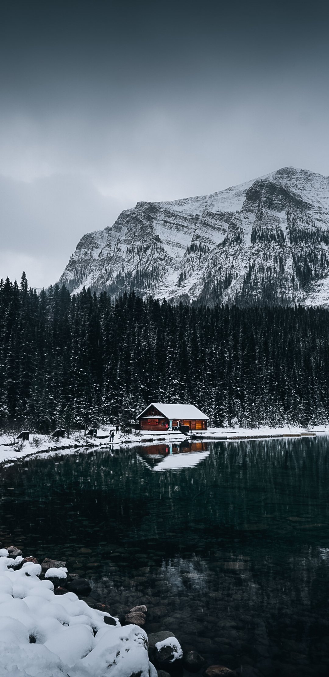 Wallpaper: lake house, snow, winter - 1080x2220