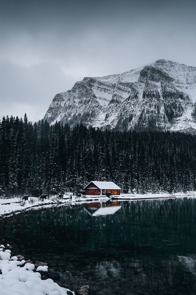 Wallpaper: lake house, snow, winter - 640x960