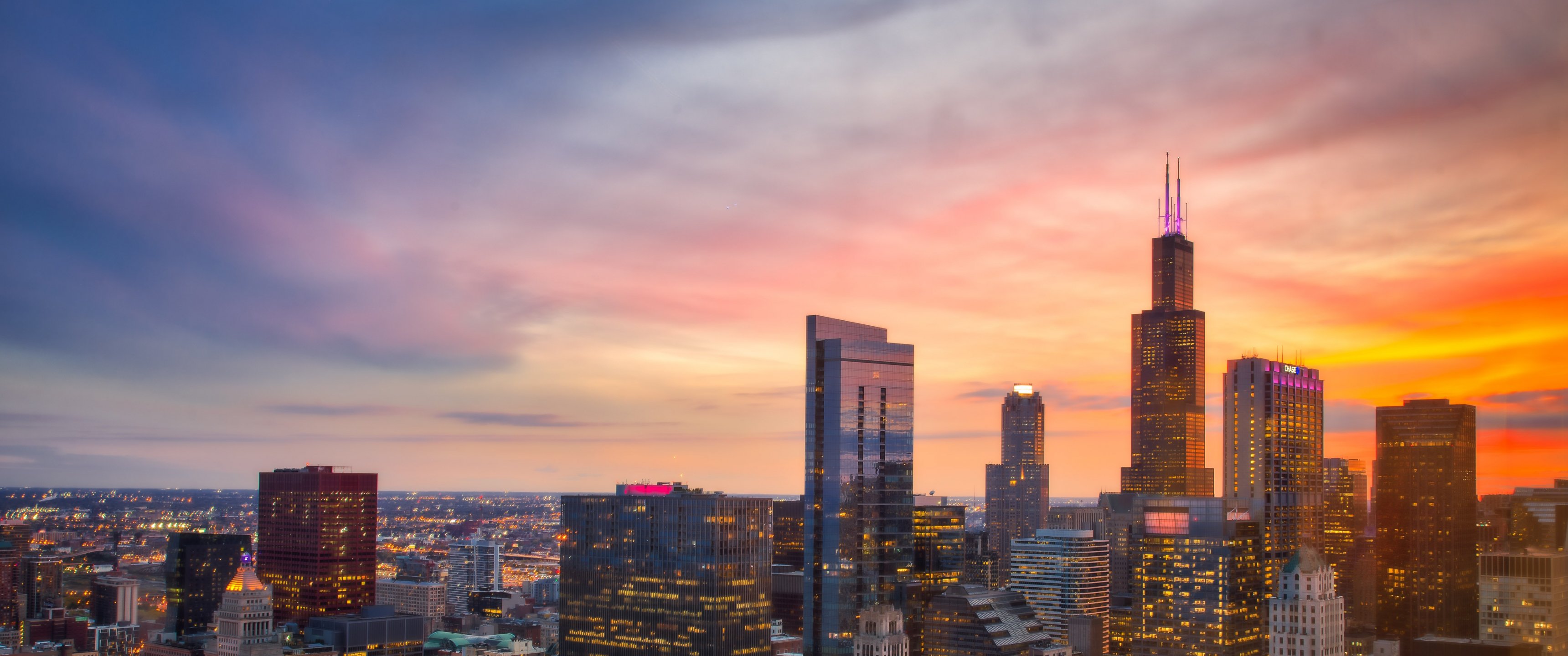 Wallpaper: Chicago, bird's eye view, sunset - 3440x1440