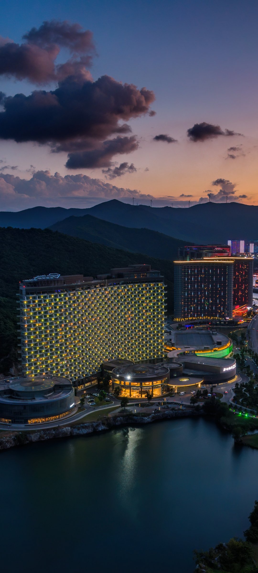 Wallpaper: bird's eye view, hotel, sunset - 1080x2400