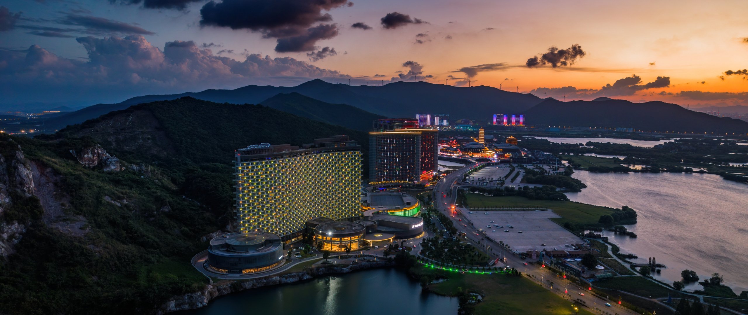 Wallpaper: bird's eye view, hotel, sunset - 2560x1080