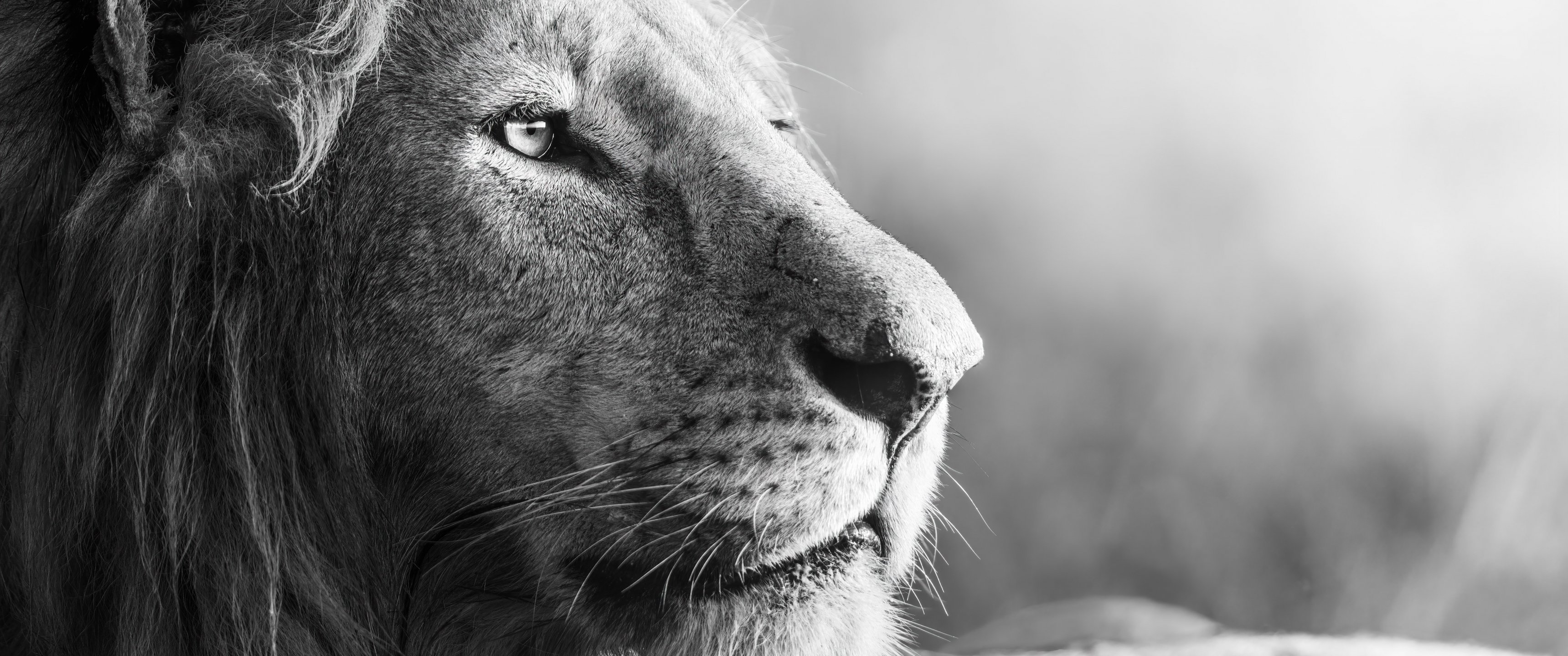 Wallpaper: lion, predator, black and white - 3440x1440