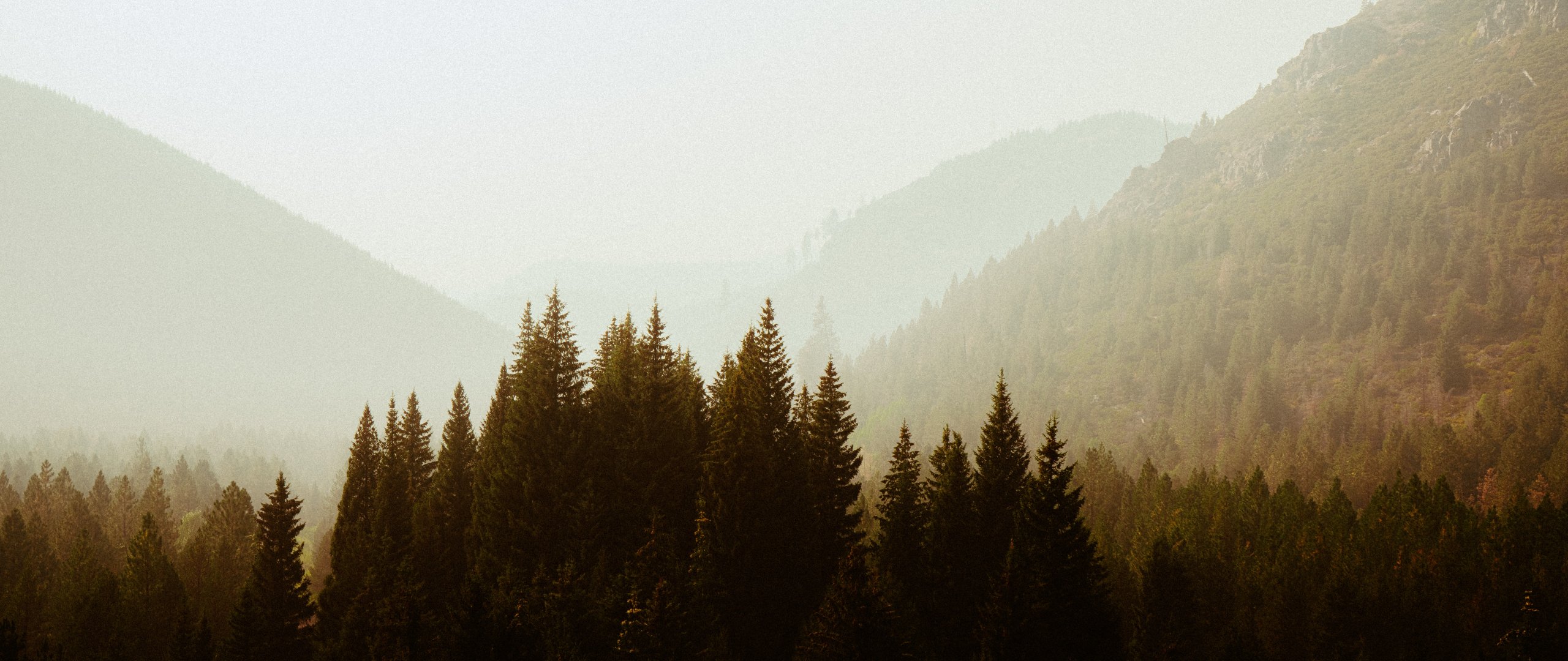 coniferous forest, fog Wallpaper 2560x1080