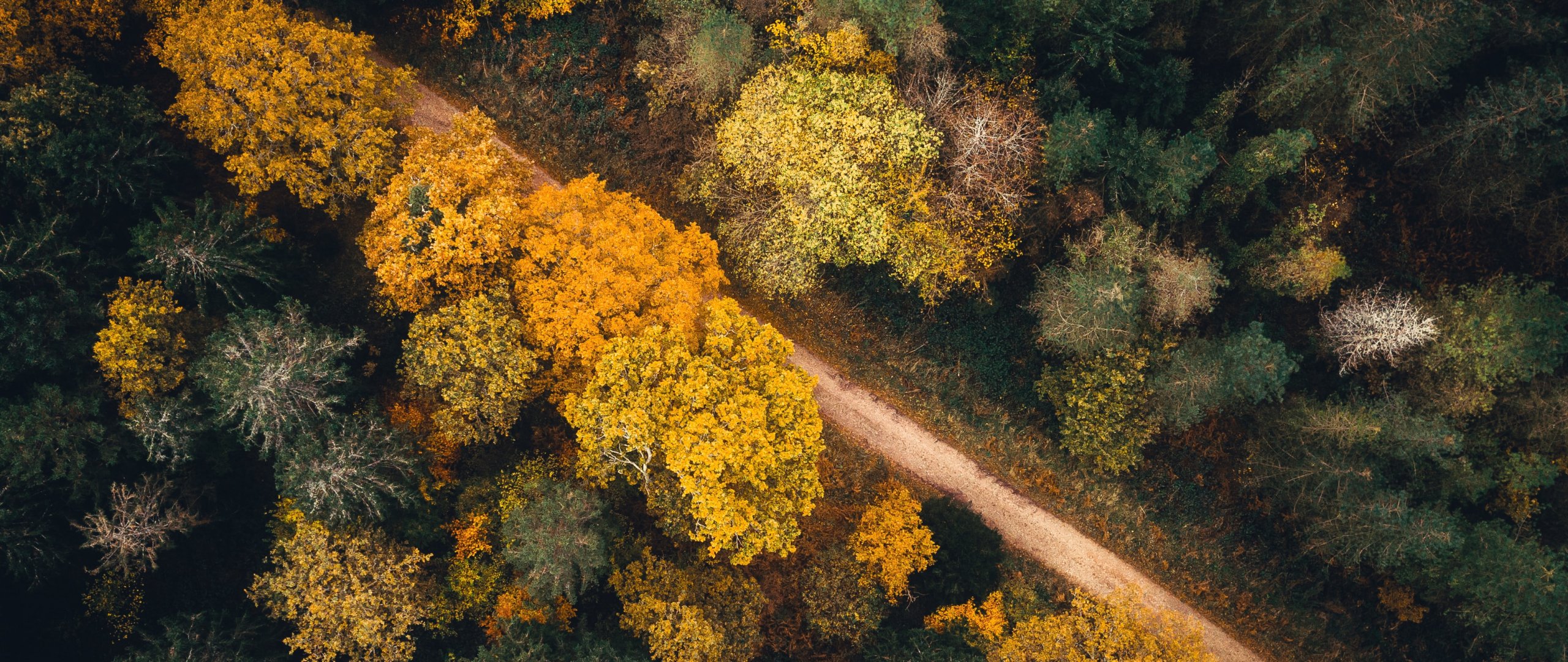 Wallpaper: autumn forest, road - 2560x1080