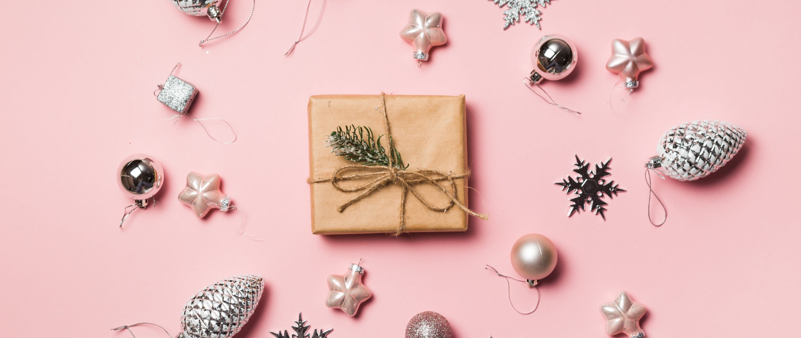 Wallpaper: Gifts, Balls, pink background - 2560x1080