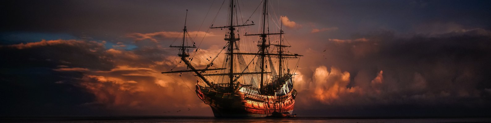 Wallpaper: Ship, sea, sunset - 1590x400