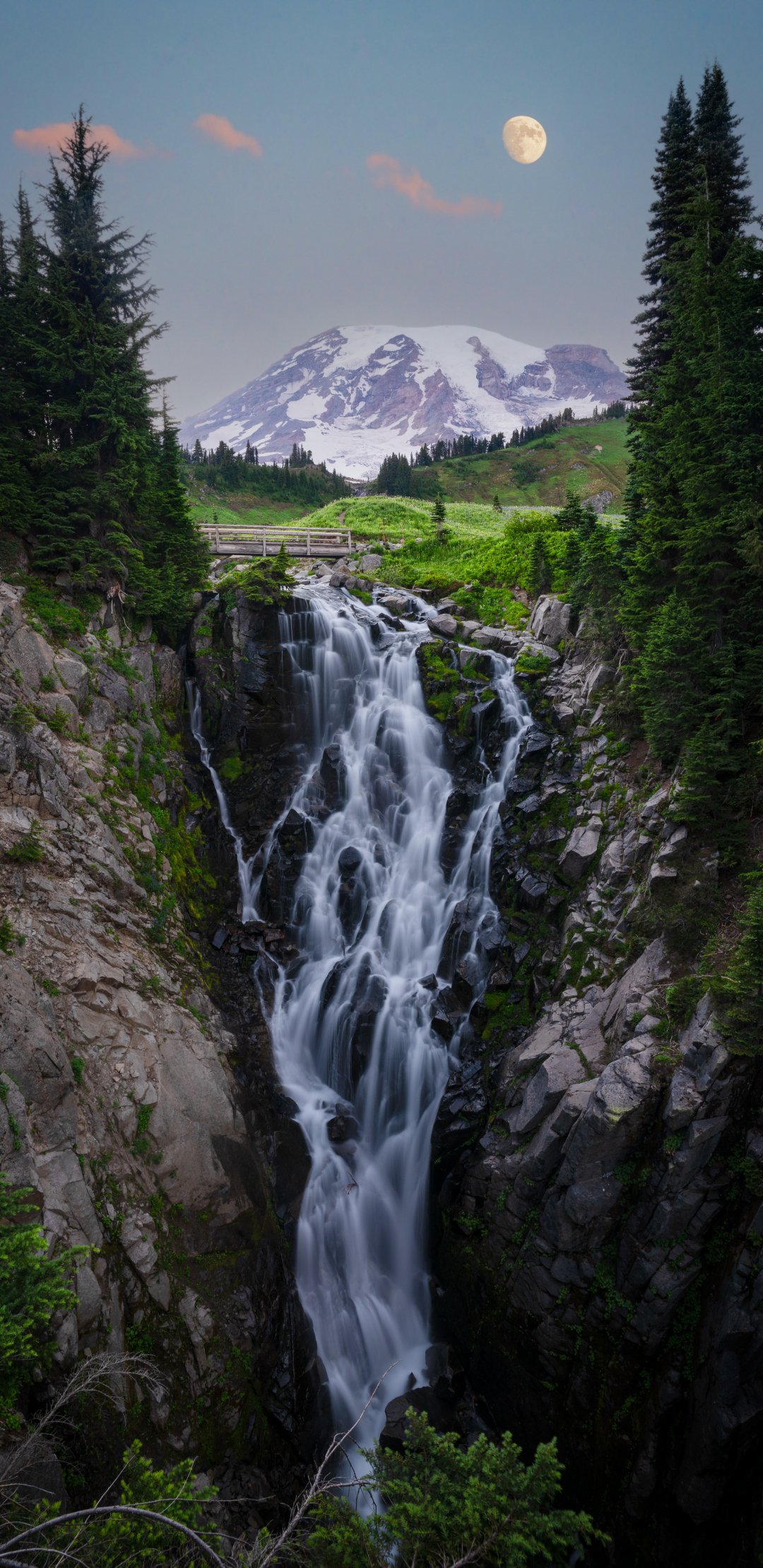 Wallpaper: waterfall, mount Rainier, moon - 1080x2220