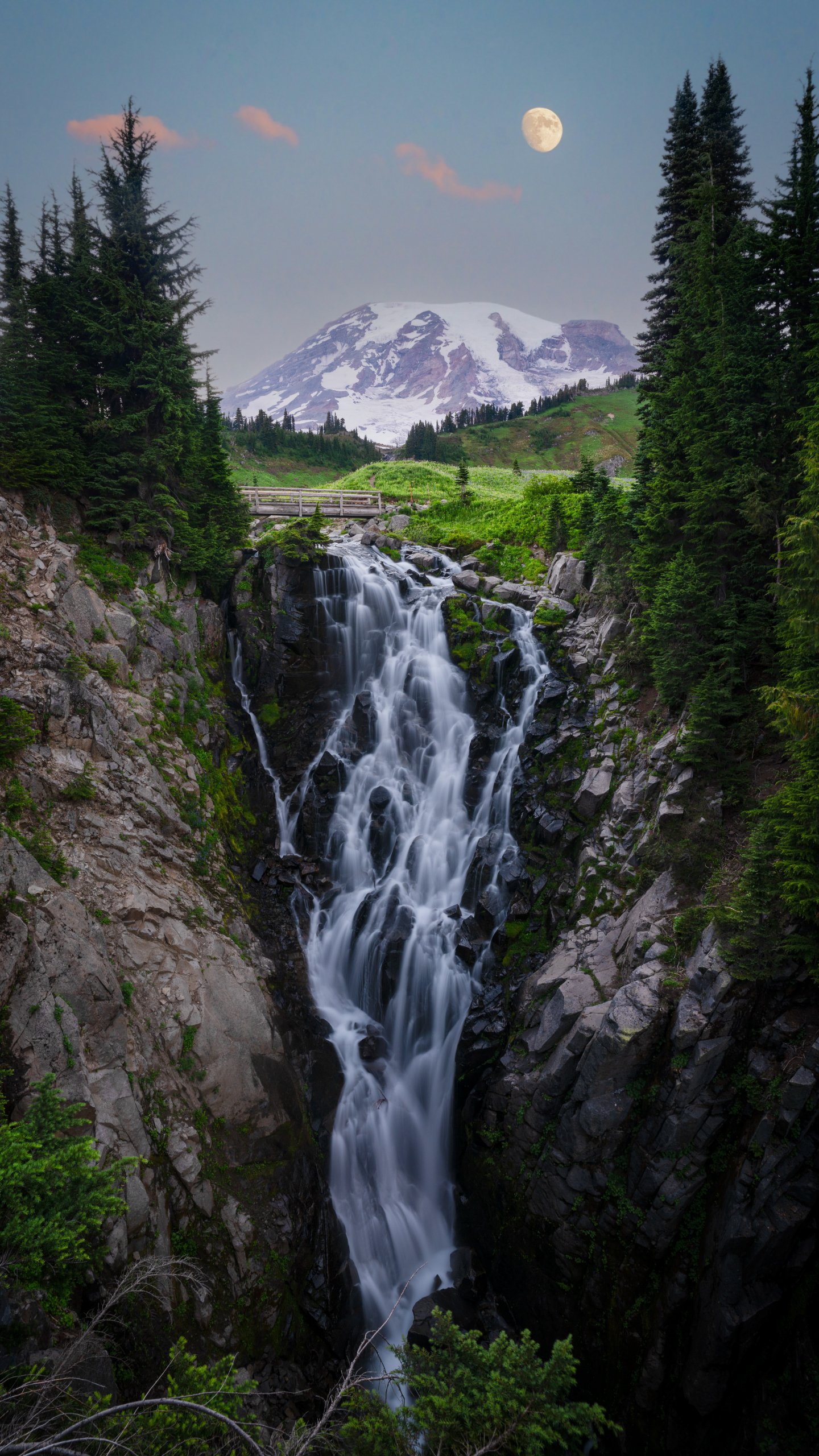 Wallpaper: waterfall, mount Rainier, moon - 1440x2560