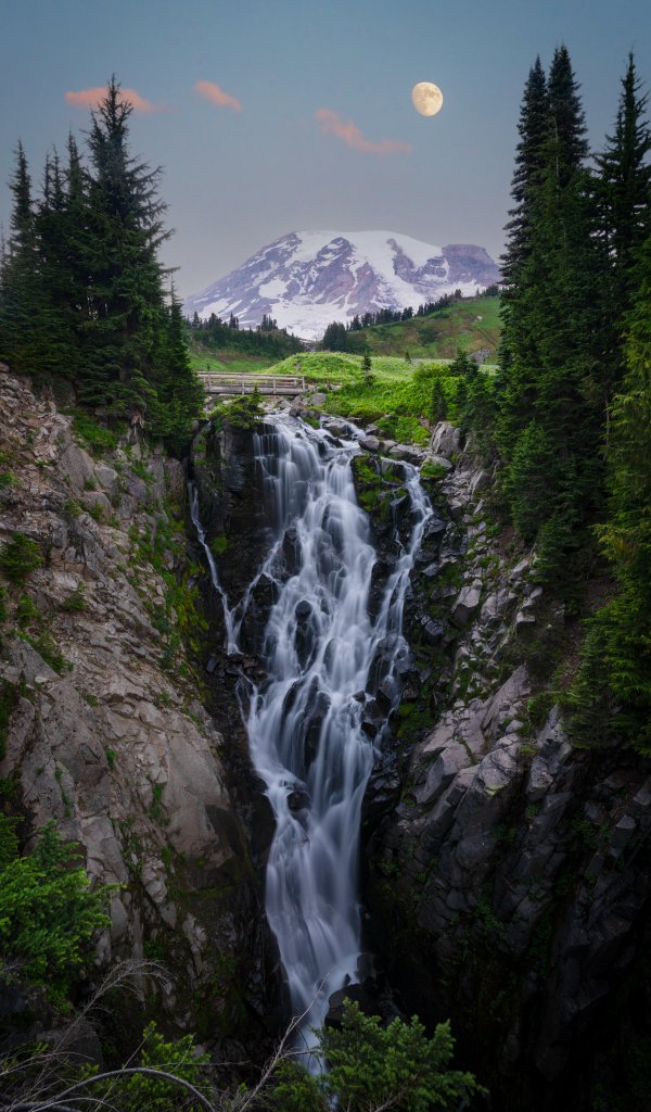 Wallpaper: waterfall, mount Rainier, moon - 600x1024