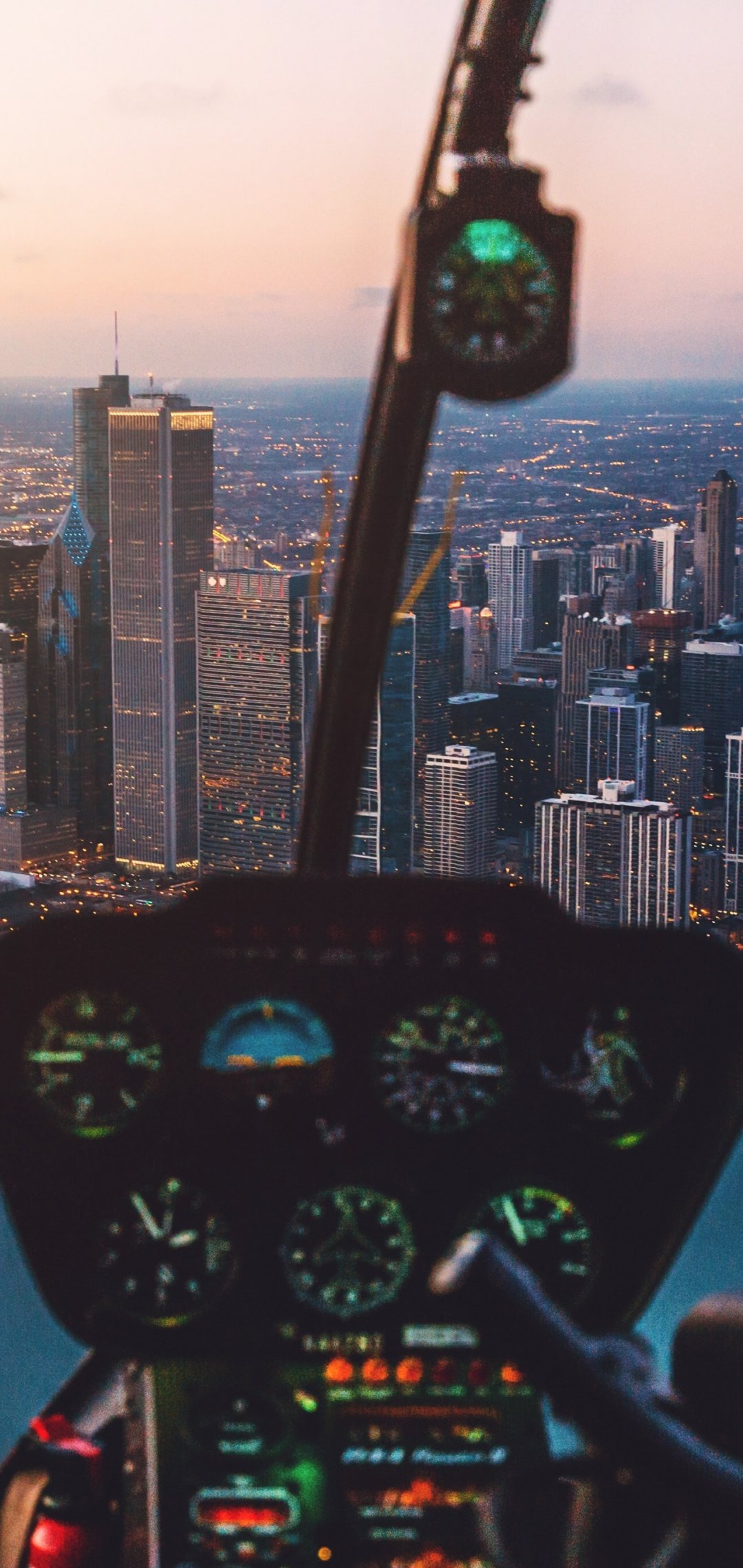 Wallpaper: helicopter cockpit, skyscrapers, flight - 1080x2280