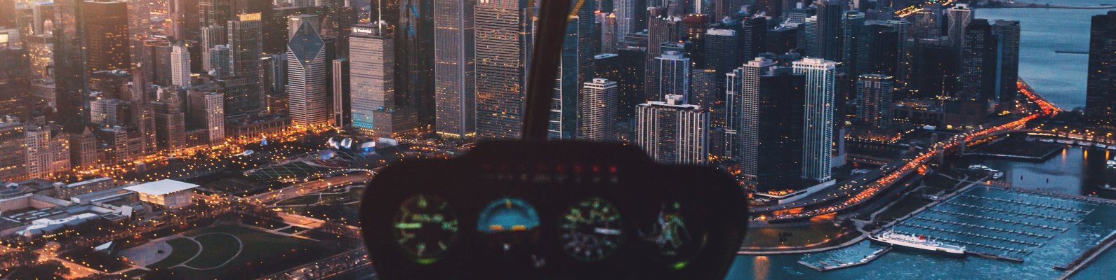 Wallpaper: helicopter cockpit, skyscrapers, flight - 1590x400