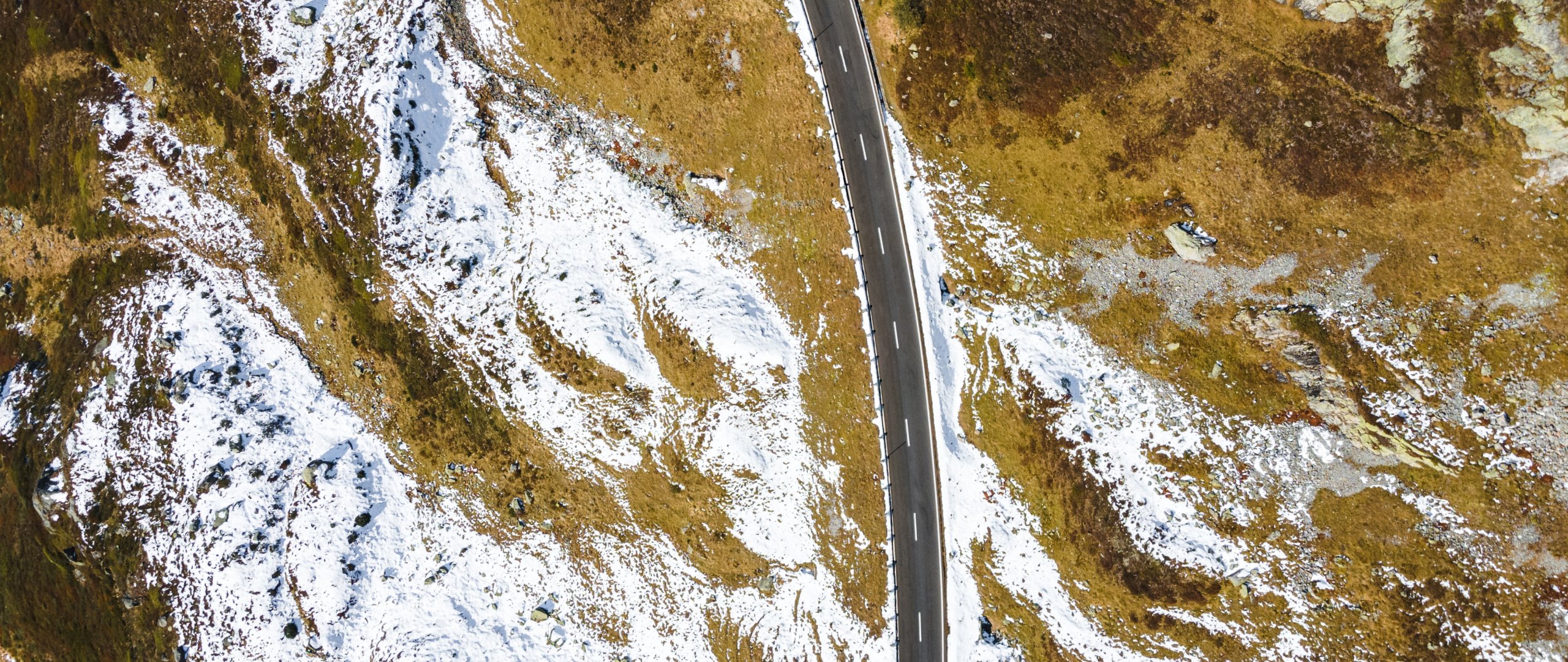 Wallpaper: top view, road, snow - 2560x1080