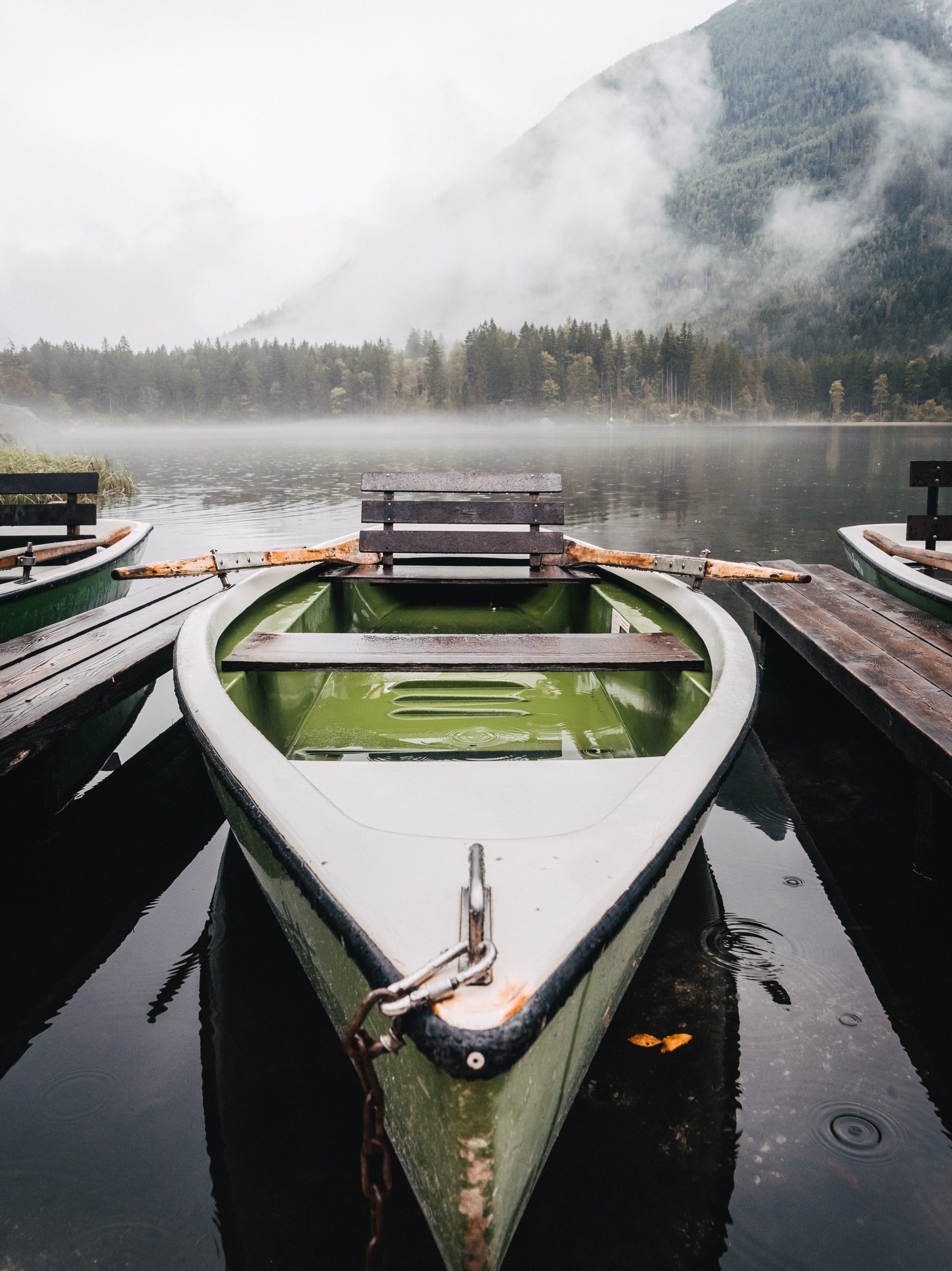 Wallpaper: boat, lake, fog, mountains - 2048x2732