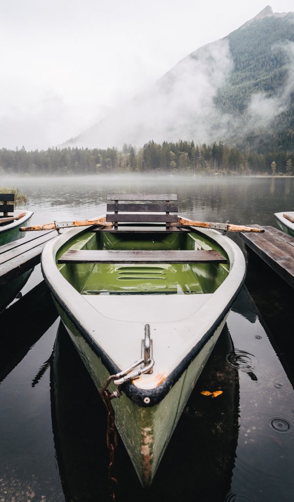 Wallpaper: boat, lake, fog, mountains - 600x1024