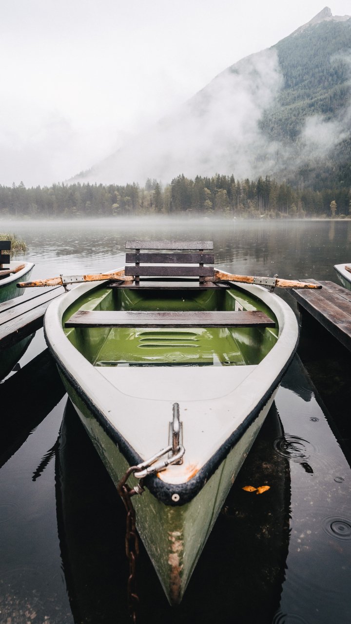Wallpaper: boat, lake, fog, mountains - 720x1280