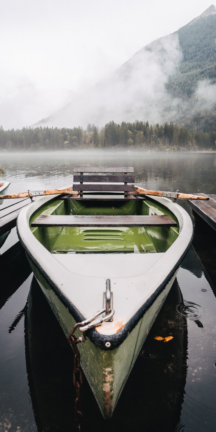 Wallpaper: boat, lake, fog, mountains - 720x1440