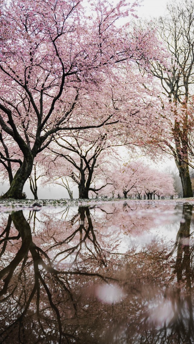 Wallpaper: sakura, Japan, reflection - 640x1136