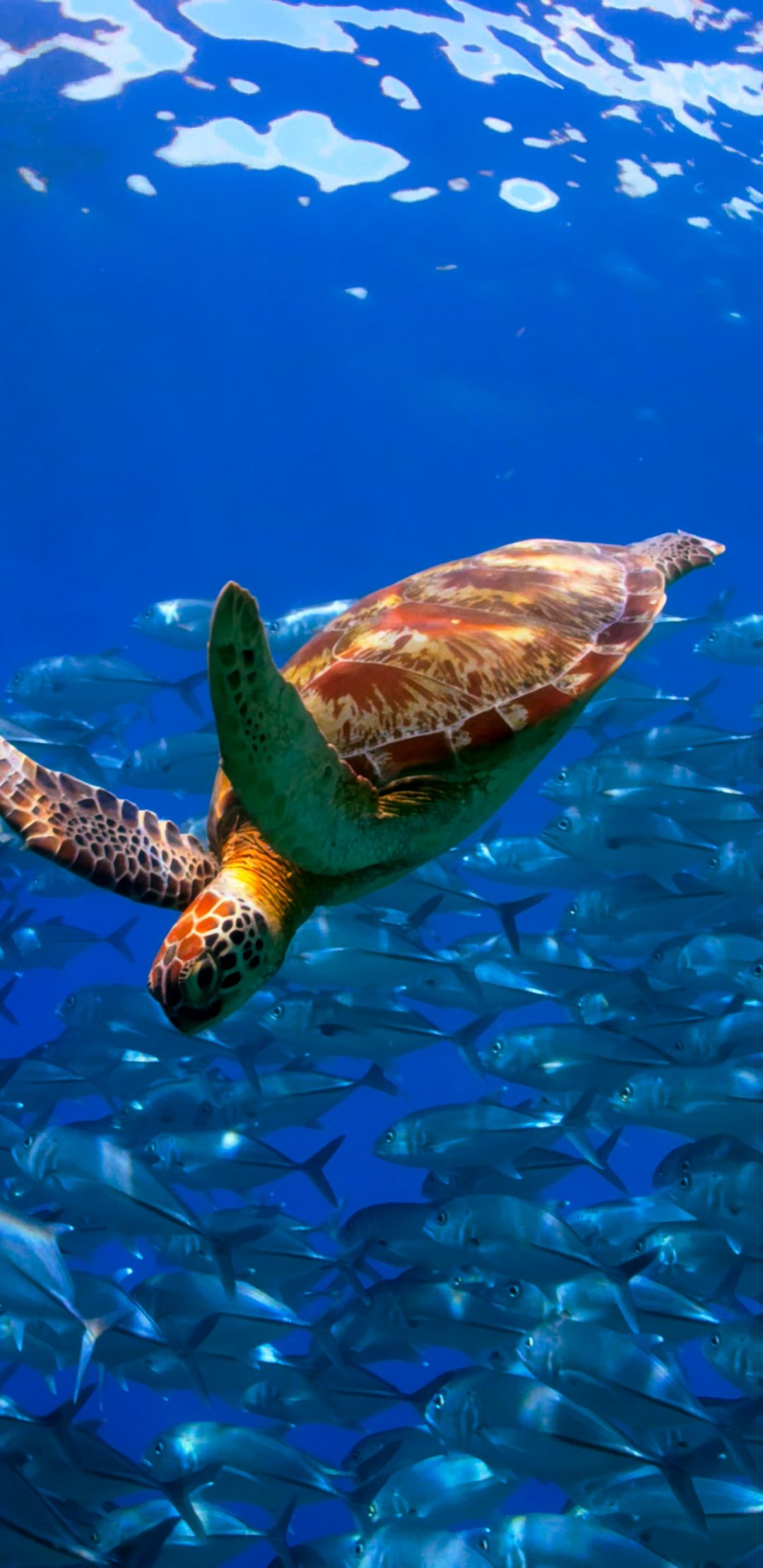 Wallpaper: turtle, school of fish - 1080x2220