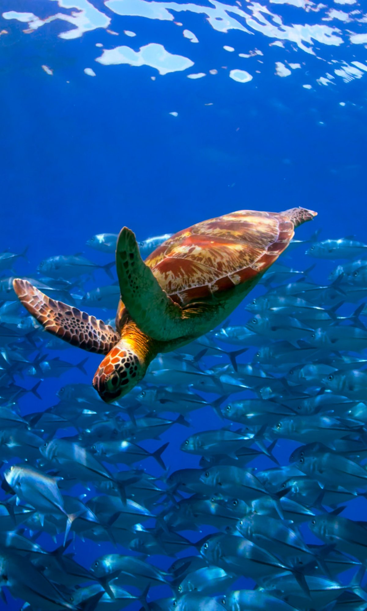 Wallpaper: turtle, school of fish - 1200x2000