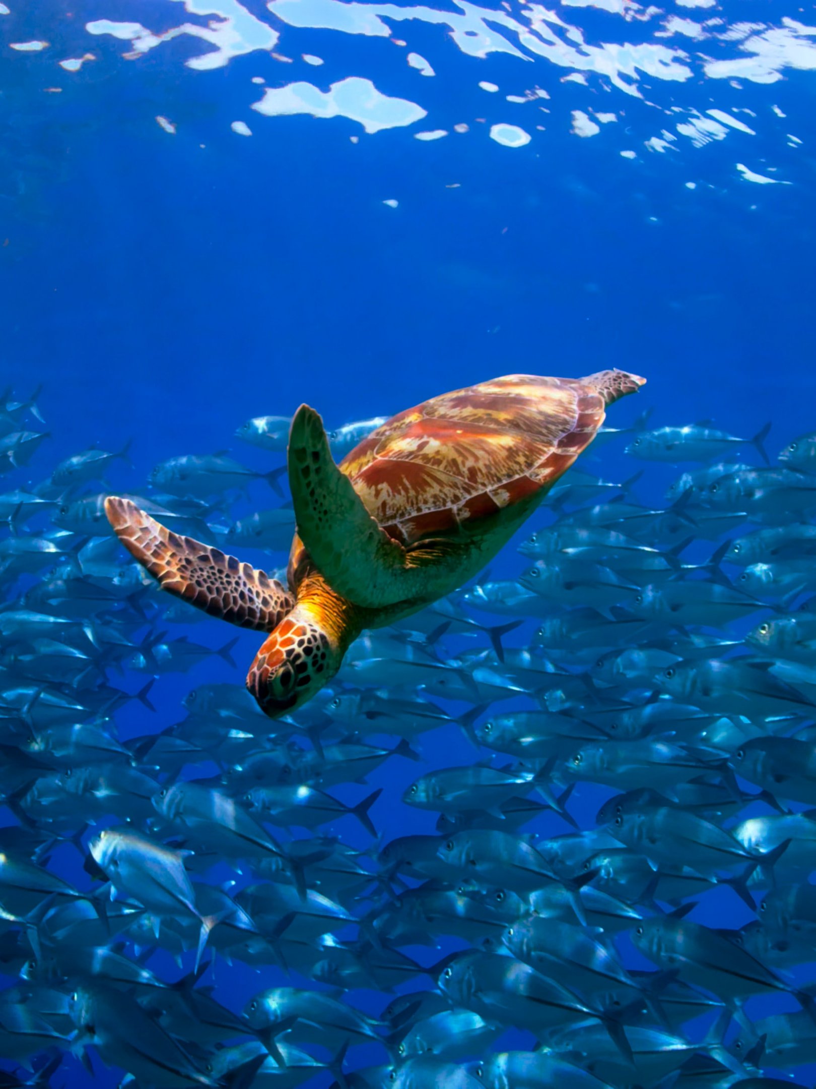 Wallpaper: turtle, school of fish - 1620x2160