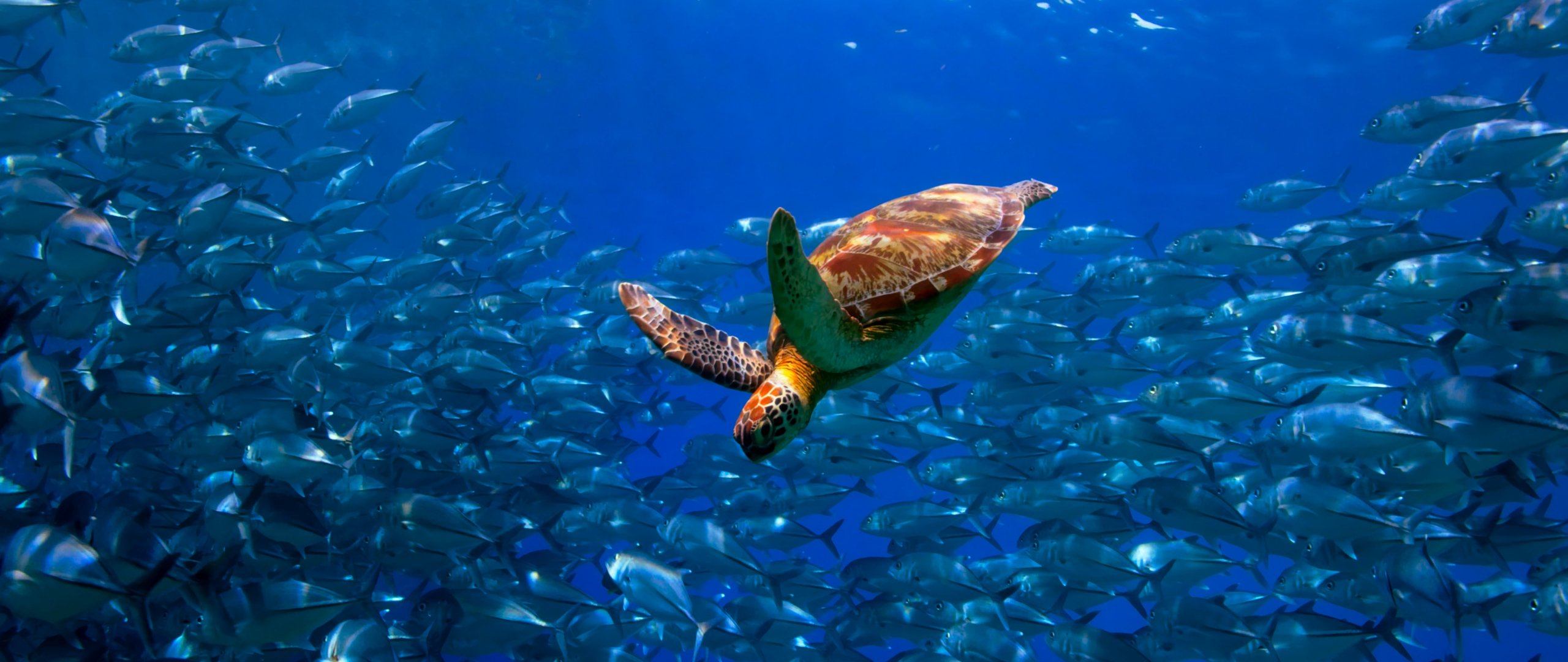 Wallpaper: turtle, school of fish - 2560x1080