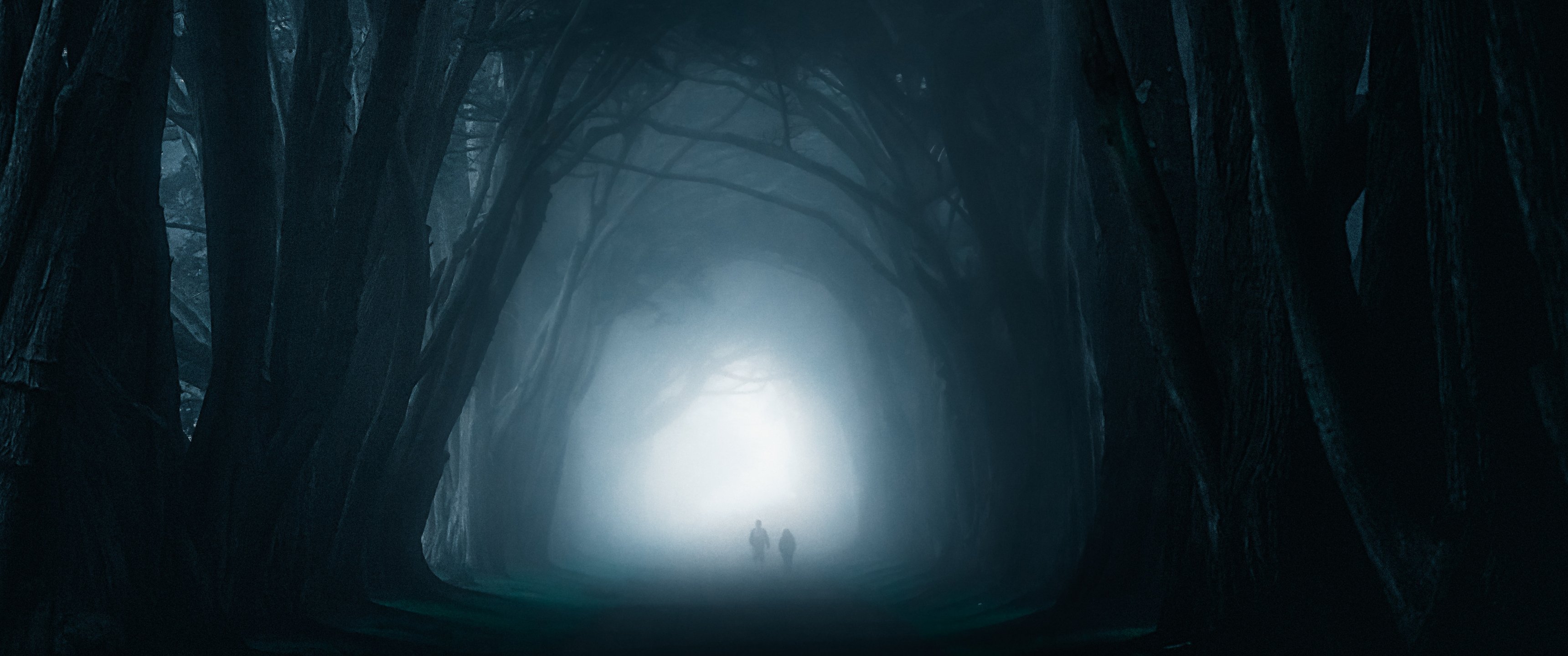 Wallpaper: fog, forest trail - 3440x1440