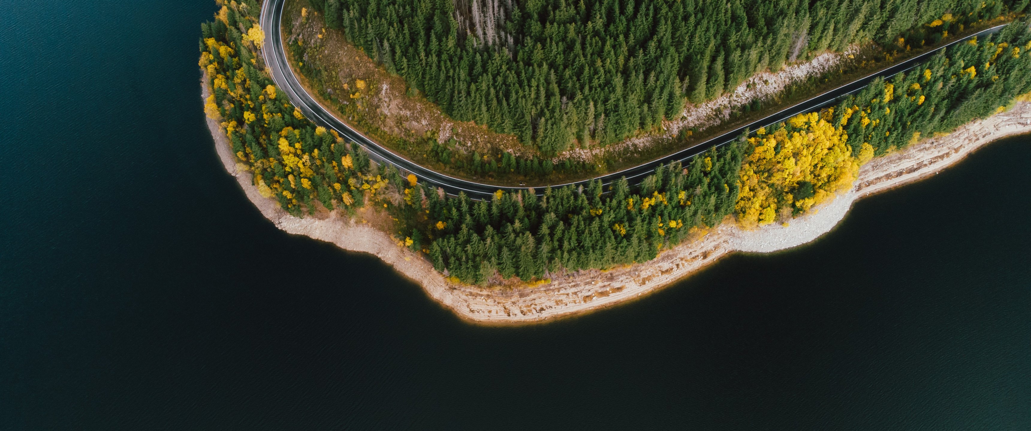 Wallpaper: shore, lake, forest - 3440x1440