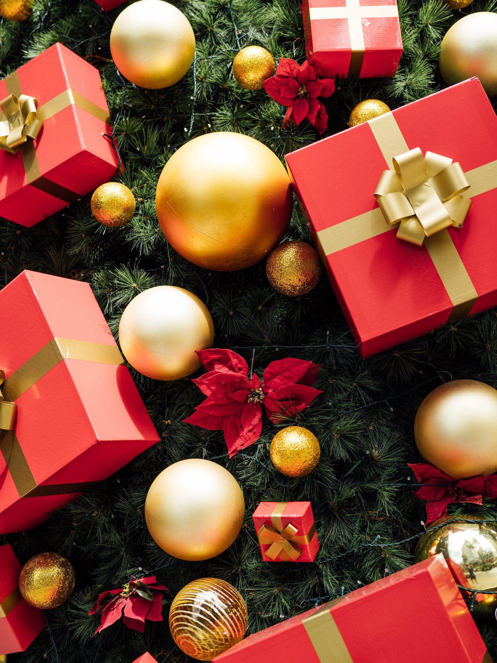 Wallpaper: gifts, holiday, balls, red - 1620x2160