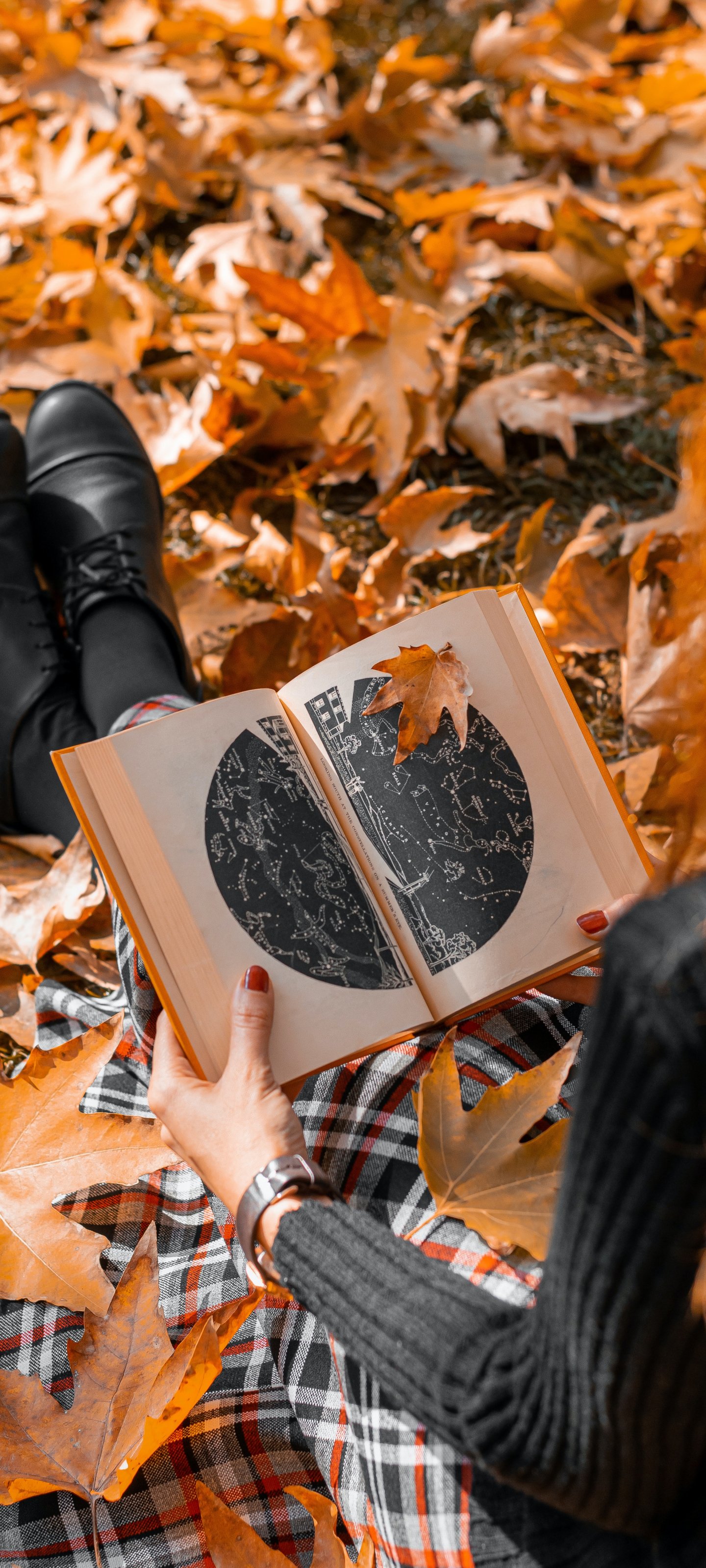 Wallpaper: autumn, girl, maple leaf, mood autumn, book - 1440x3200