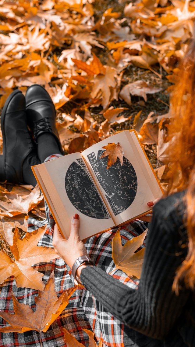 Wallpaper: autumn, girl, maple leaf, mood autumn, book - 640x1136