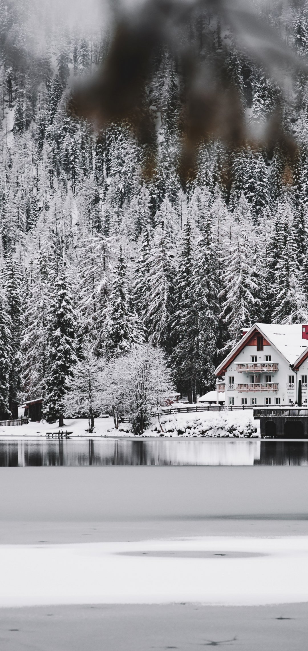 Wallpaper: winter, snow, cold, ice, lake house, forest, in the woods - 1080x2280