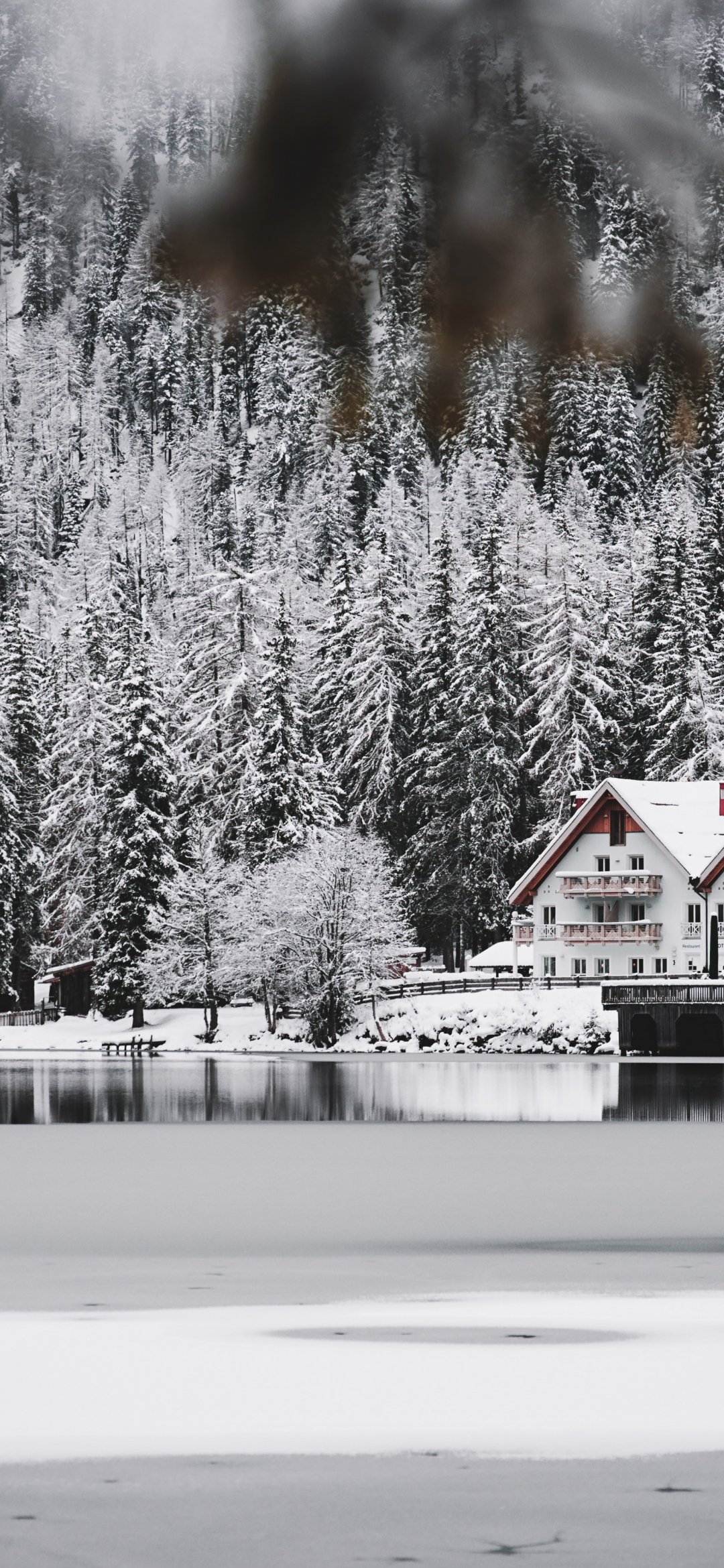 Wallpaper: winter, snow, cold, ice, lake house, forest, in the woods - 1080x2340