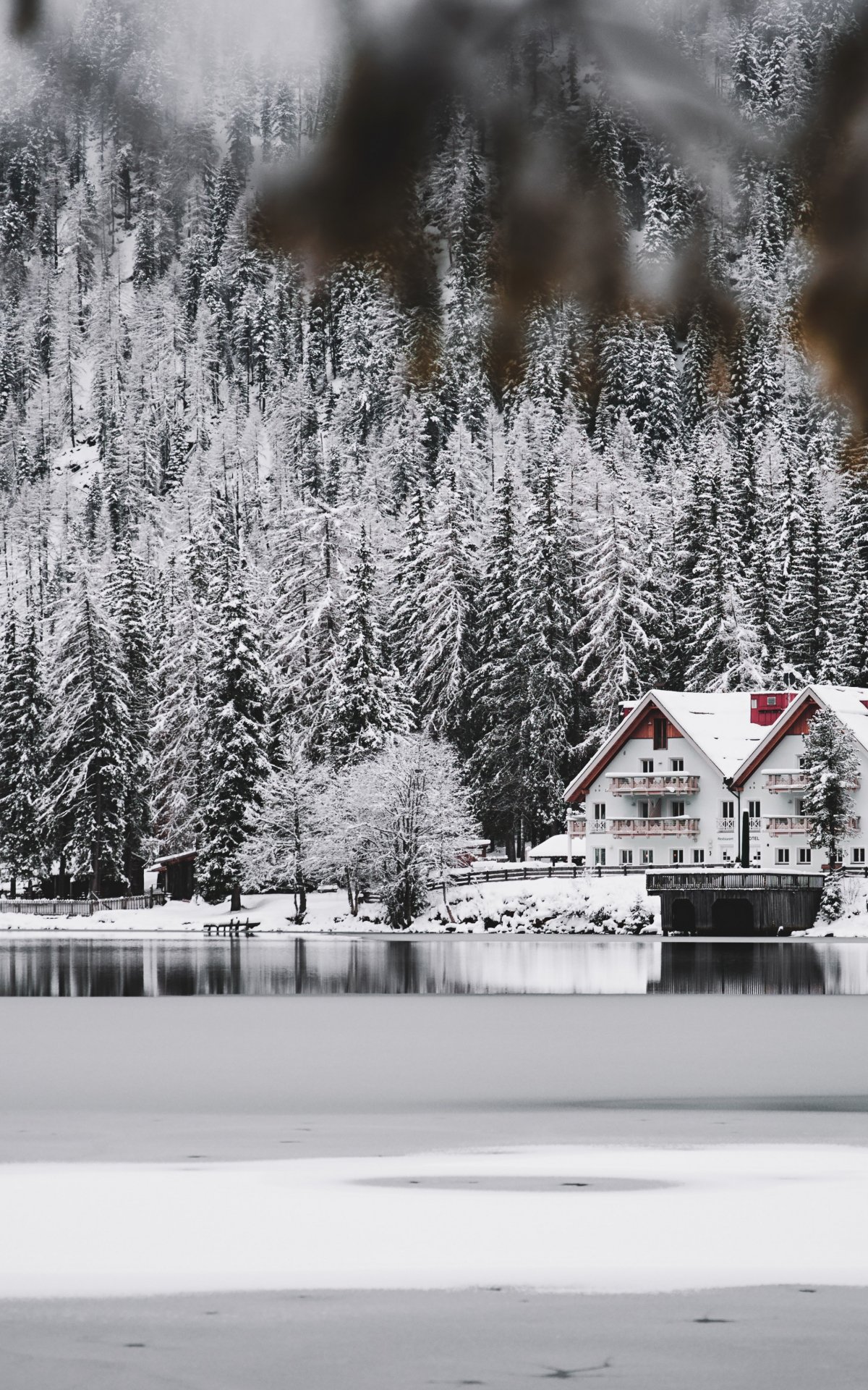 Wallpaper: winter, snow, cold, ice, lake house, forest, in the woods - 1200x1920