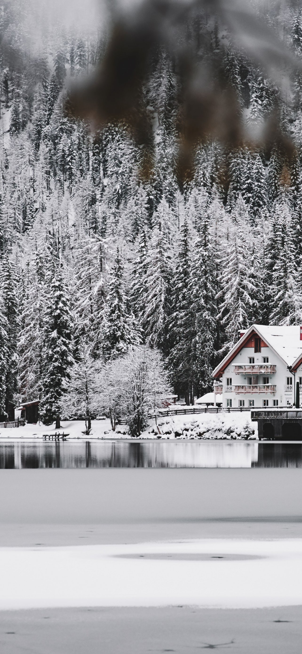 Wallpaper: winter, snow, cold, ice, lake house, forest, in the woods - 1284x2778