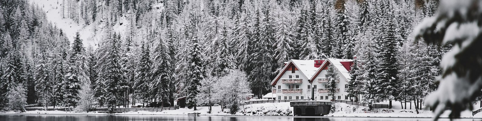 Wallpaper: winter, snow, cold, ice, lake house, forest, in the woods - 1590x400