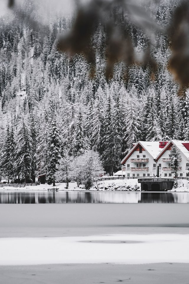 Wallpaper: winter, snow, cold, ice, lake house, forest, in the woods - 640x960