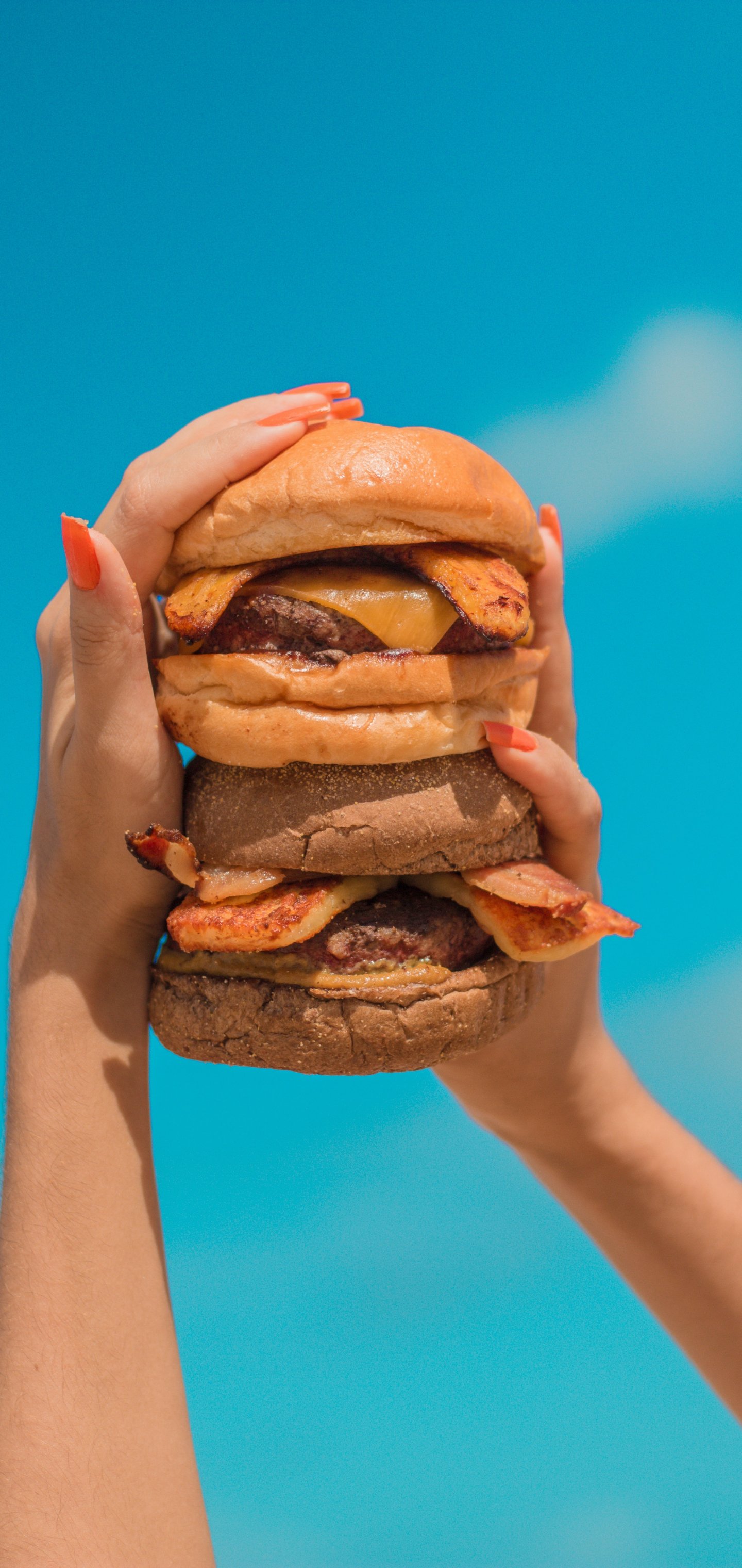 Wallpaper: burger, girl, hands, sky, cheese, cutlet, bun, food - 1440x3040