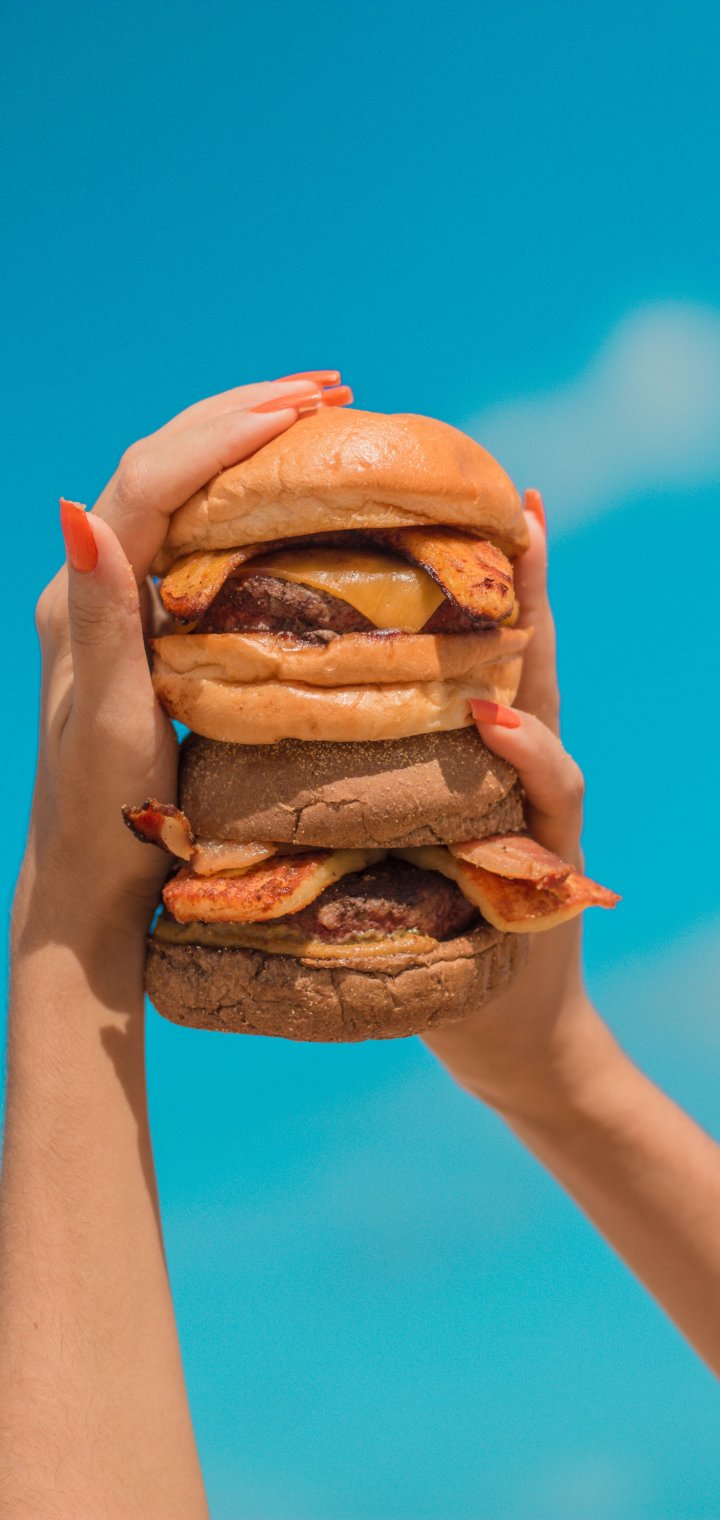 Wallpaper: burger, girl, hands, sky, cheese, cutlet, bun, food - 720x1520