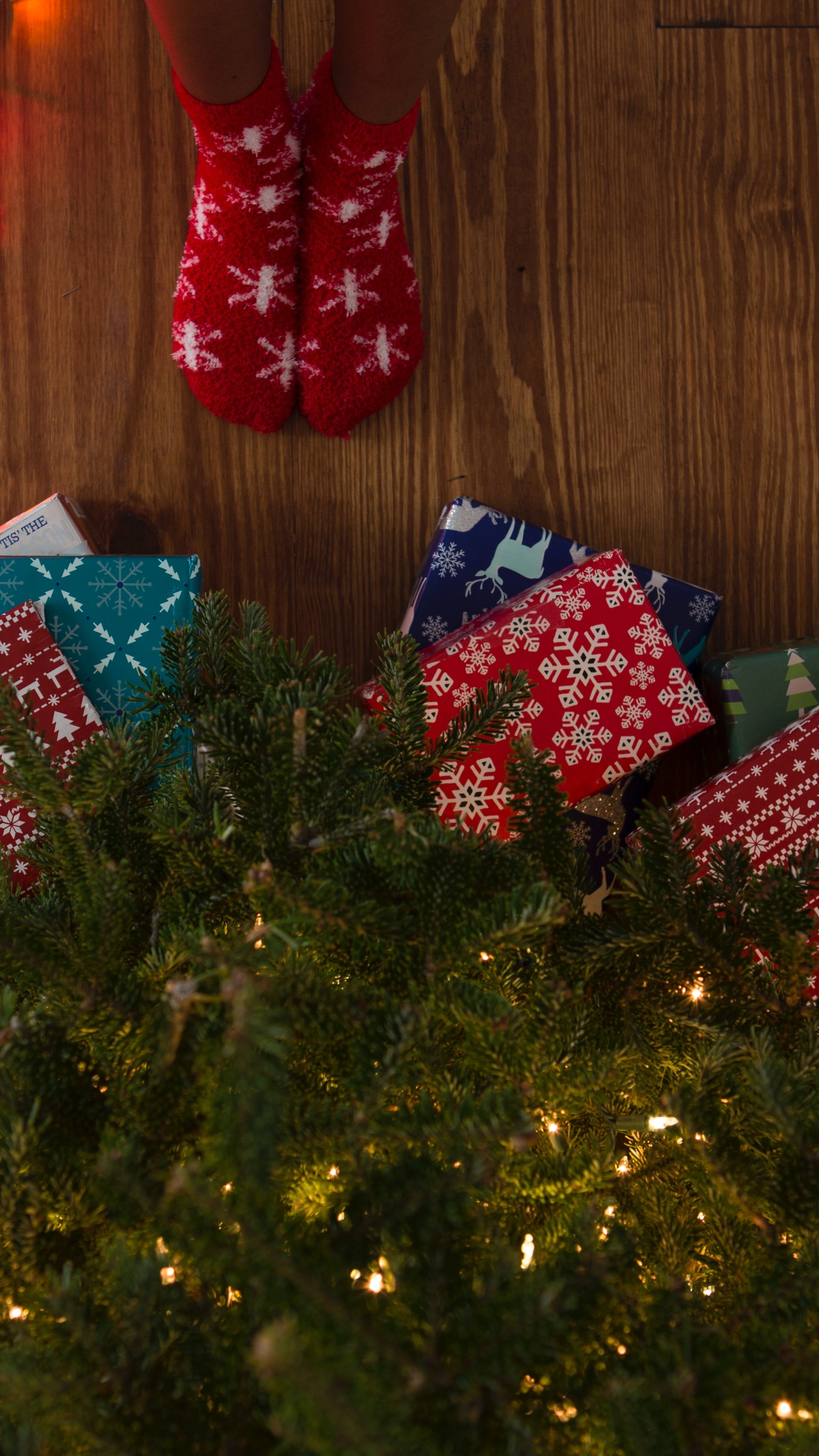 Wallpaper: gifts, Christmas tree, holidays, feet, socks, bright light bulbs - 2160x3840