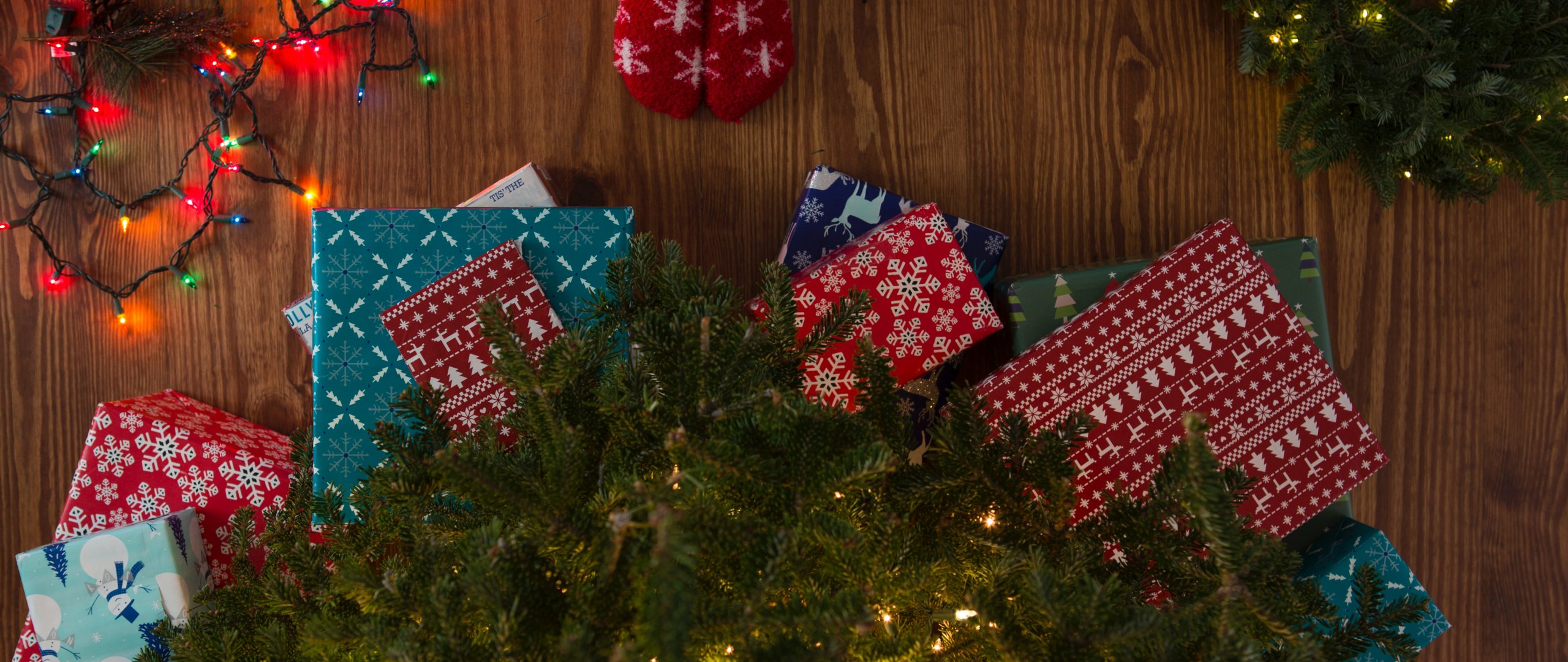 Wallpaper: gifts, Christmas tree, holidays, feet, socks, bright light bulbs - 2560x1080